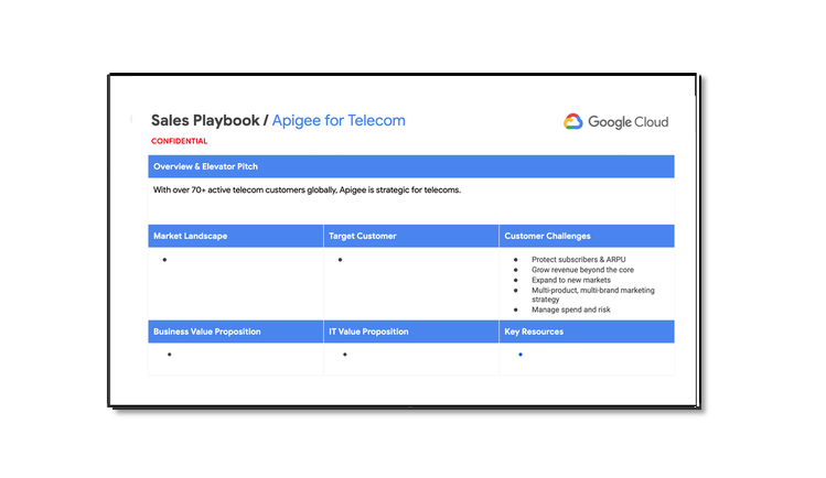 High level Apigee industry specific sales plays and guides to give partner account executives ability to joint sell the telco solution.
